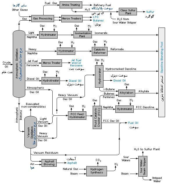 در شکل پروسسهای معمول در یک پالایشگاه نفت نشان داده شدهاست. پالایشگاههای نفت شامل واحدهای پروسس مختلفی است که در ذیل به توضیح مختصر هر یک از موارد میپردازیم: